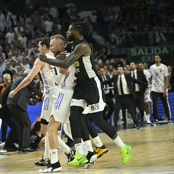 Košarkaši Partizana poveli su sa 2:0 protiv Real Madrida u četvrtfinalu Evrolige, pošto su u Španiji pobedili sa 95:80 u utakmici koja je zbog opšte tuče na terenu prekinuta minut i 40 sekundi pre kraja.