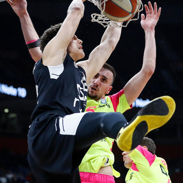 Čak ni to što su pritrčala dvojica igrača Mege da mu se prepreče, nije ga sprečilo da silovito zakuca i "posterizuje" ih.