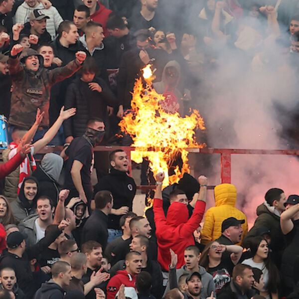 "Delije" su danas na svom Severu simbolično naopačke razvile obeležja "Fedayn Rome", a onda ih zapalile balkljama.