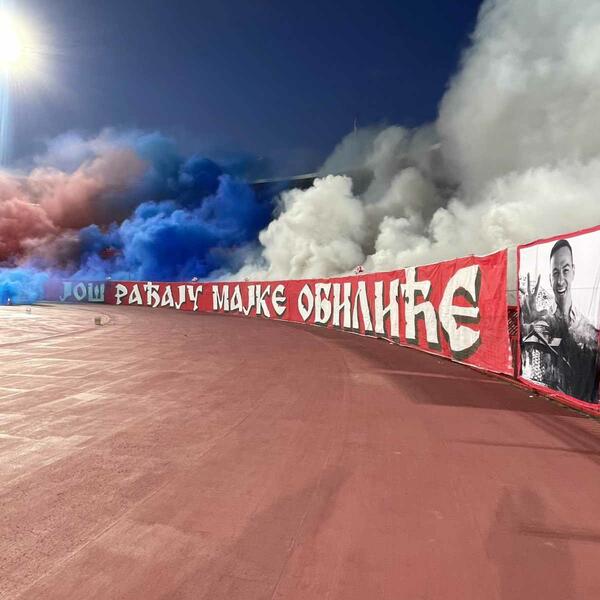 Pristalice Crvene zvezde na početku navijanja skandirale su njegovo ime i prezime, uz transparente "Sloga biće poraz vragu" i "Još majke rađaju Obiliće."