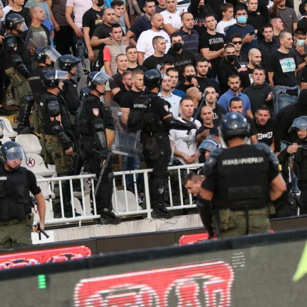 Na samom početku utakmice izbila je tuča između navijača grobara na istočnoj tribini.