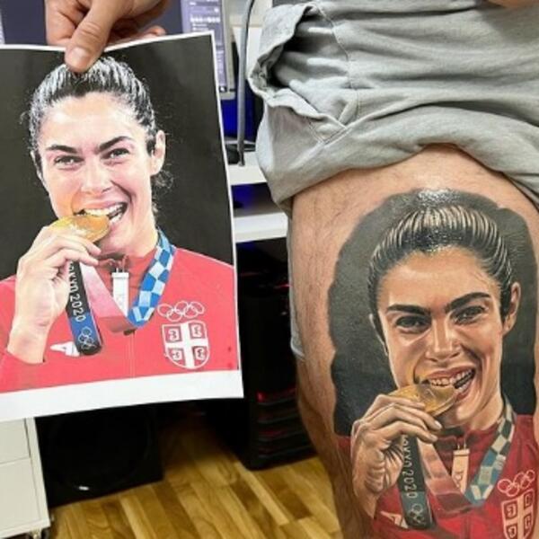 Đuričić je istetovirao lik svoje drage, a na slici se vidi kako Milica nasmejana grize zlatnu olimpijsku medalju iz Tokija.