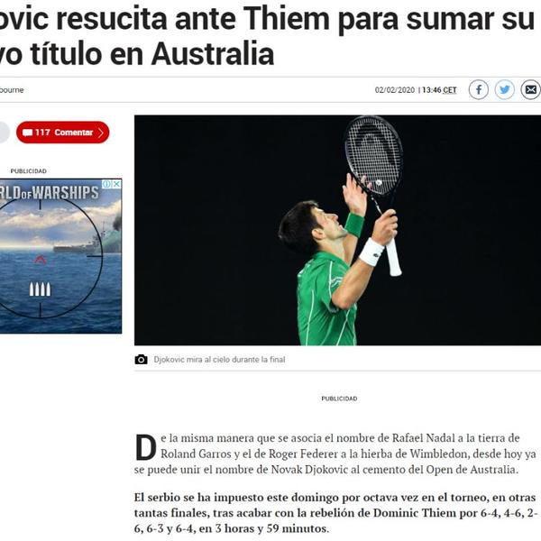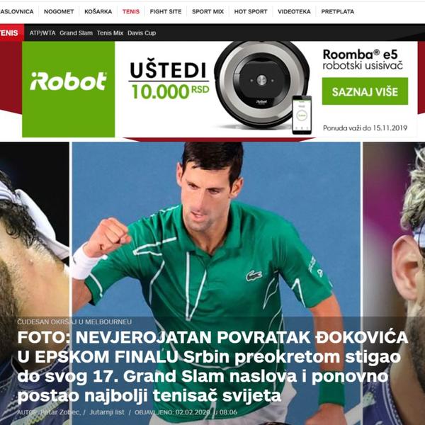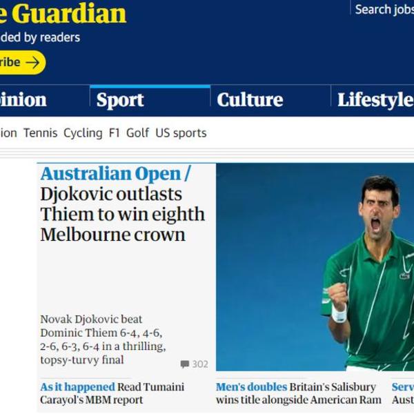 Hrvatski portal Indeks, pod nalsovom "Neverovatni Đoković preokretom osvojio 17. gren slem" piše da je srpski teniser u neverovatnom finalu Australijan opena pobedio Dominika Tima posle četiri sata igre.