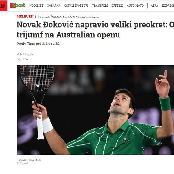 Novu gren slem titulu srpskog tenisera ispratio je i portal Klix.ba, navodeći da je "Fenomenalni Novak Đoković u Melburnu osvojio osmu titulu i 17. titulu na Gren slem turnirima u fenomenalnom meču savladao je Dominika Tima rezultatom 3:2 u setovima".