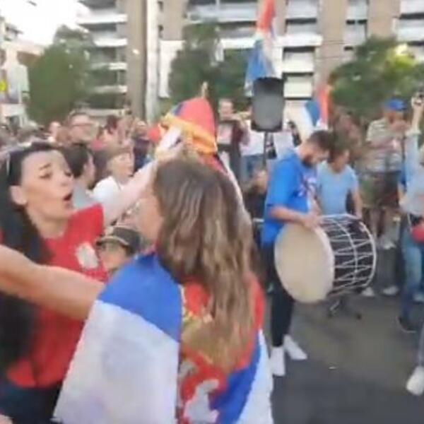 Muzika ponovo trešti, ovoga puta sa zvučnika koje su Novakovi navijači doneli na protest, a igra se i srpsko kolo. Tu je sada već prepoznatljiva navijačica sa guslama, šajkače, zastave...