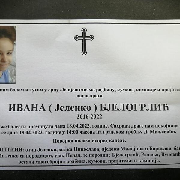 Šestogodišnja Ivana Bjelogrlić iz Istočnog Novog Sarajeva, koja je preminula nakon višegodišnje borbe sa karcinomom, sahranjena je danas na groblju u Miljevićima.