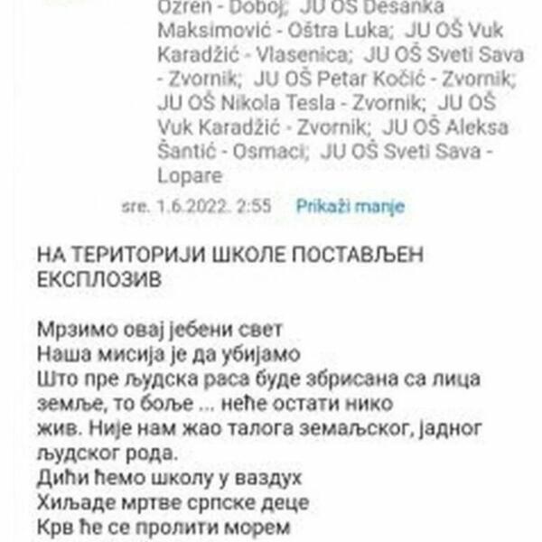 - Na teritoriji škole postavljen eksploziv Mrzimo ovaj je**ni svet Naša misija je da ubijamo Što pre ljudska rasa bude zbrisana sa lica zemlje to bolje ... neće ostati niko živ. Nije nam žao taloga zemaljskog, jadnog ljudskog roda. Dići ćemo školu u vazduh Hiljade mrtve srpske dece Krv će se proliti morem Mi smo među vama Svi ćete umreti - piše u mejlu.