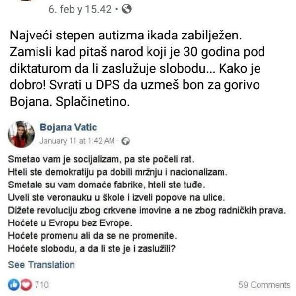 Povodom izliva nežnosti Vatićeve prema antifašističkom ustrojstvu Crne Gore, fejsbuk statusom se oglasio i Luka Radonjić, secirajući svaku njenu rečenicu hiruški precizno, čiju će reakciju, nadamo se, pročitati i Vatićeva.