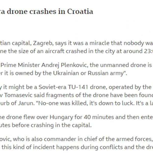 Britanski BBC je objavio kako hrvatske vojne službe pretražuju mesto pada bespilotne letelice u Zagrebu. Navode kako se dron srušio u blizini studenstkog doma, a prenose i izjave Tomaševića i Plenkovića.