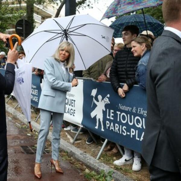 Prva dama Francuske izabrala je jednostavno, ali moćno odelo u hladnoj svetloplavoj boji, koje je sačinjeno od cigaret pantalona na crtu i oversized sakoa, kakve Brižit i inače obožava.