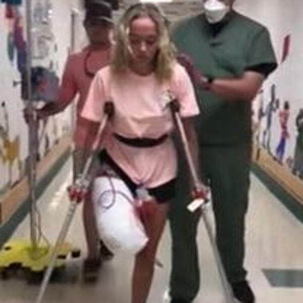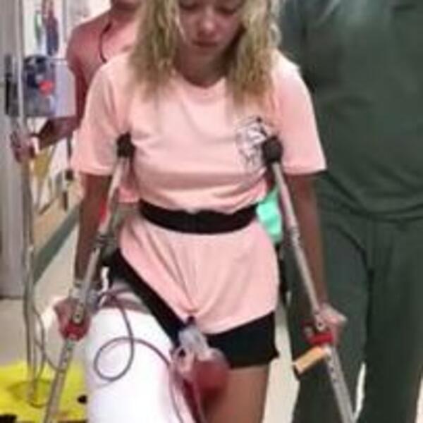 Njoj u savladavanju hoda na štakama pomažu doktor i stariji brat Ret, koji sa njom vežbaju u bolničkom hodniku.