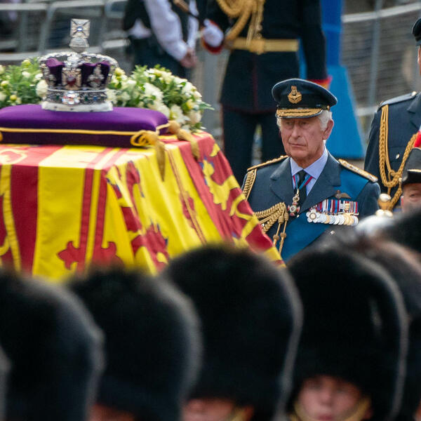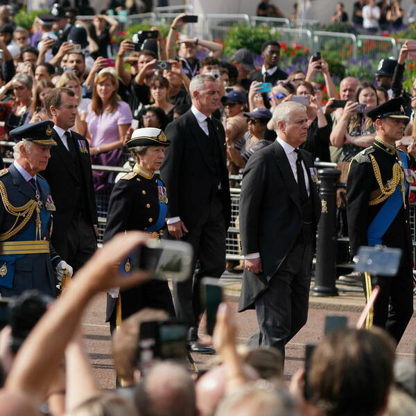 Kralj Čarls Treći, princeza Ana i prinčevi Endrju i Edvard stajali su leđima okrenuti kovčegu kraljice, pognutih glava, prenosi AP.