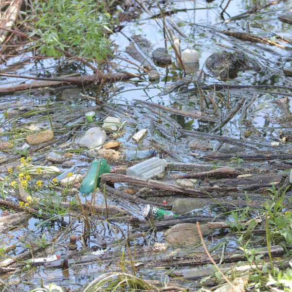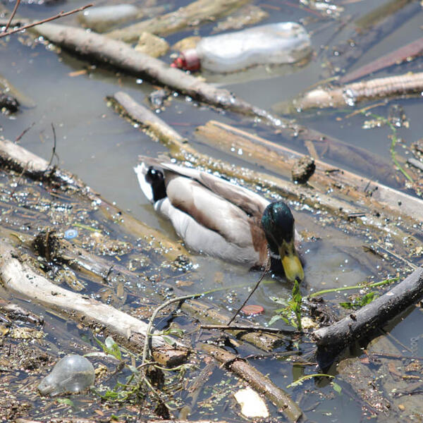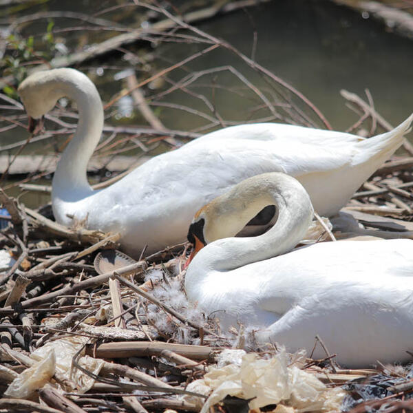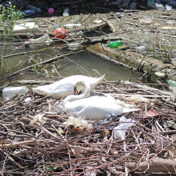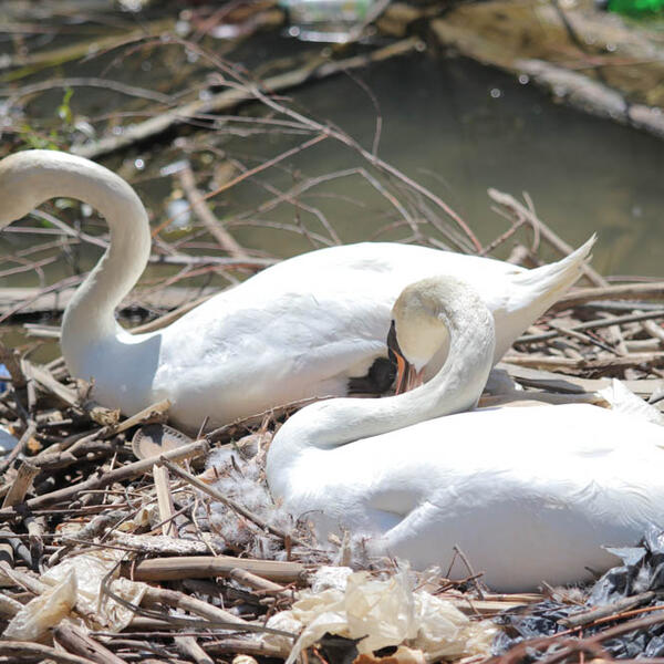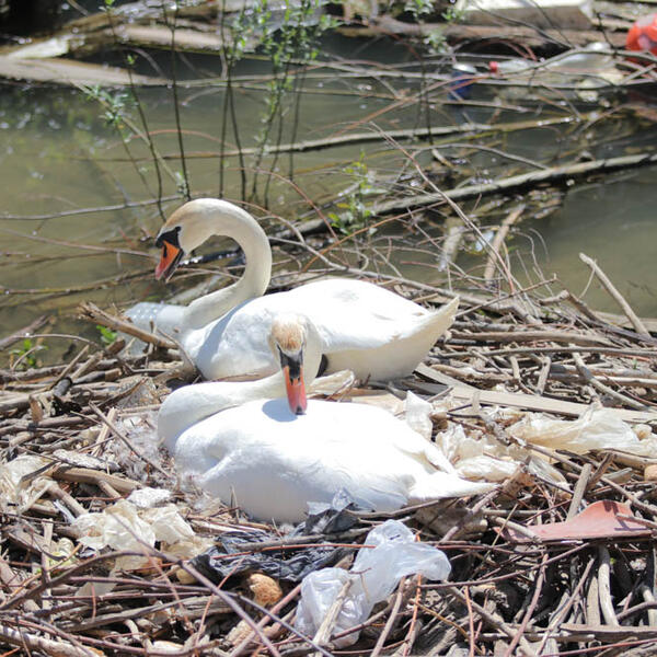 Gnezdo okruženo smećem. Na njemu labud budno posmatra sve oko sebe, dok labudica nepomično leži na jajima.