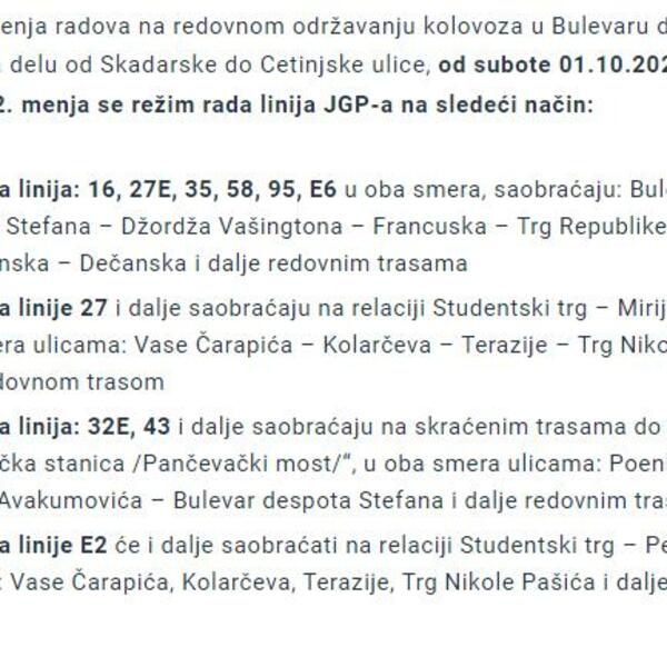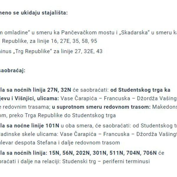 Na stajalištu kod Skadarske, u pravcu ka Novom Beogradu, istaknuto je obaveštenje da se ono ukida, navedena je nova ruta kojom se vozila kreću, ali ne i stanica na kojoj građani mogu da sačekaju prevoz. Od ovog upozorenja nema mnogo vajde, jer je ovaj deo bulevara raskopan, pa niko i ne ulazi dalje u ulicu da čita obaveštenje.