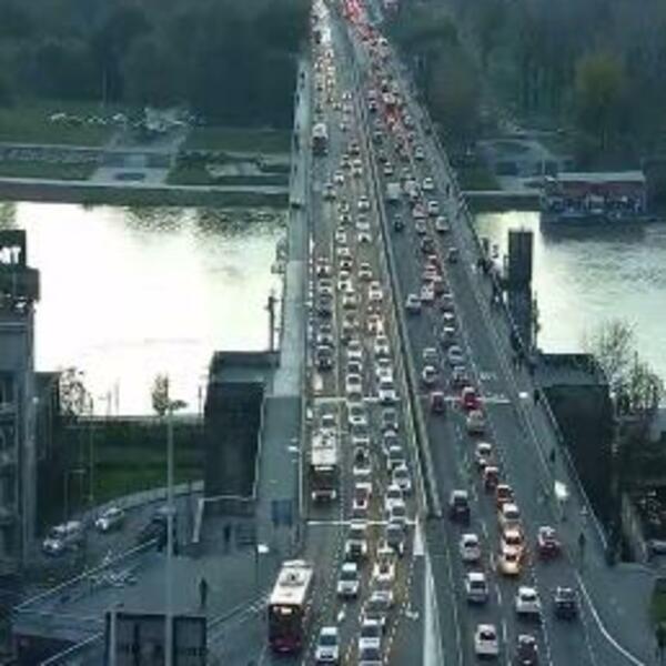 Kilometarski redovi vozila kreću se Bulevarom Mihajla Pupina ka Brankovom mosu i duž njega.