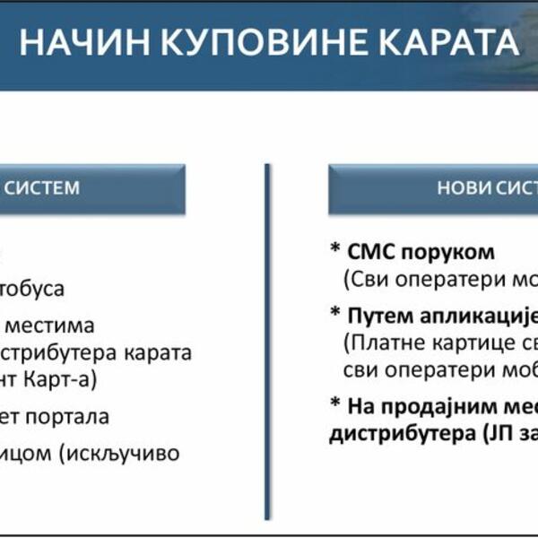 Kupovina karata u novom sistemu se može obaviti SMS porukom (Svi operateri mobilnih mreža), putem aplikacije za telefon (Platne kartice svih vrsta i svi operateri mobilnih mreža) i na svim prodajnim mestima distributera (JP za naplatu karata).