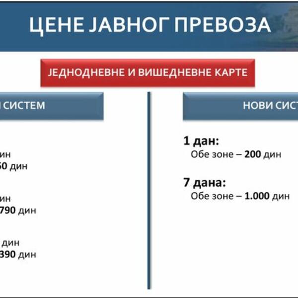 Što se tiče jednodnevnih i višednevnih karata, u novom sistemu za jedan dan, obe zone koštaće 200 dinara, dok će za sedam dana koštati 1.000 dinara.
