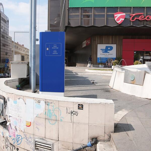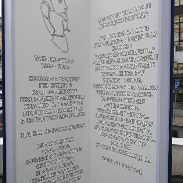 Ovo obeležje otkriveno je na rođendan Studija B, 1. aprila 2012. godine, kada je i čitav plato ispred Palate „Beograd” poneo ime novinara Đoke Vještice, ali je nažalost polomljeno 2019. godine.