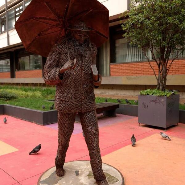 Kao uzor za skulpturu, koja je visoka oko 2,5 metra uzeta je fotografija na kojoj pesnik, nošen vetrom i kišom, šeta ulicama Beograda.