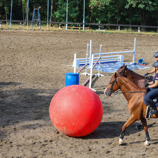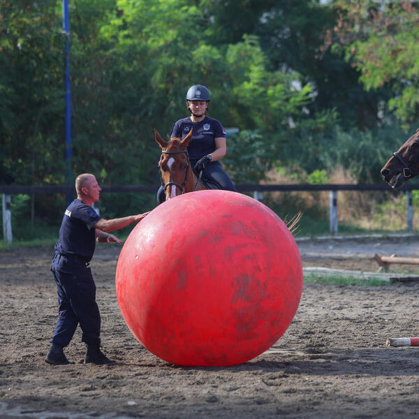 Neke od treninga su nam demonstrirali, poput guranja velike lopte kojom se konji uče da prevazilaze prepreke i da ih se ne plaše kada se susretnu sa njima i da ih guraju napred.