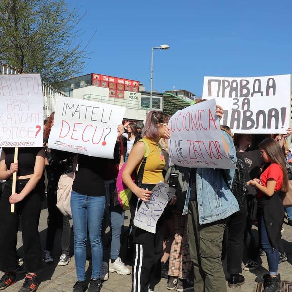 14:02 Ispred gimnazije okupio se veliki broj učenika koji u rukama drži transparente sa parolama: "Pravda za Pavla", "Imate li decu?", "Nije srpski ćutati na krivicu", "Učionica, a ne zatvor".