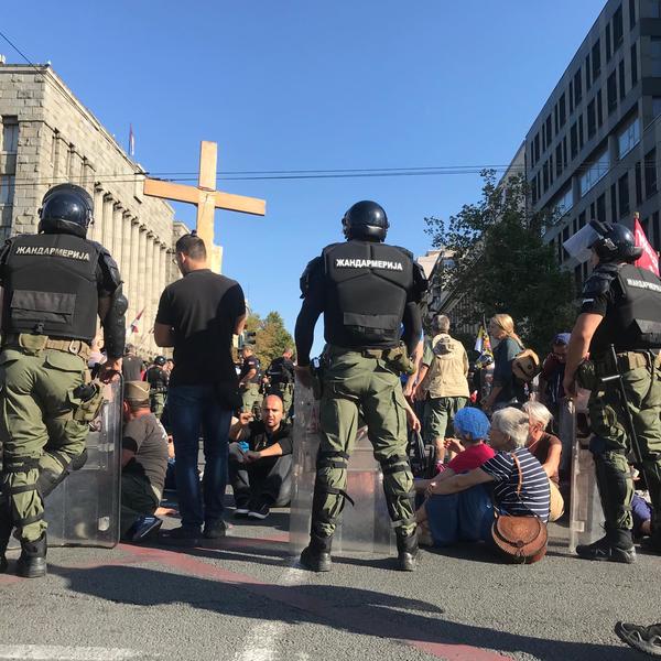 I pre nego što se okupljanje koje je zakazano za 17 časova održalo, negde oko 14 časova okupili su se protivnici održavanja Prajda. Jedan od njih pokrio se Isusovom slikom na platnu, a imali su ceo performans nasred ulice.