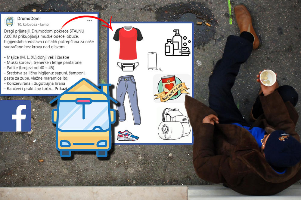 - Dragi prijatelji, Drumodom pokreće STALNU AKCIJU prikupljanja muške odeće, obuće, higijenskih sredstava i ostalih potrepština za naše sugrađane bez krova nad glavom. - Majice (M, L, XL),donji veš i čarape - Muški šorcevi, trenerke i letnje pantalone - Patike (brojevi od 40 – 45) - Sredstva za ličnu higijenu: sapuni, šamponi, paste za zube, vlažne maramice itd. - Konzervirana i dugotrajna hrana - Rančevi i praktične torbice - Vreće za spavanje - Polovni mobilni telefoni sa punjačima - Molimo Vas da se pre dolaska obavezno najavite na broj 060 408 78 02, a Vaše polovne stvari možete doneti utorkom i četvrtkom u periodu od 9 do 15h u Radoslava Grujića br 4 (Vračar, Beograd). Molimo Vas da donesete samo stvari navedene u oglasu i da odeća koju donosite bude čista, naročito imajući u vidu trenutnu epidemiološku situaciju, naveli su u saopštenju.
