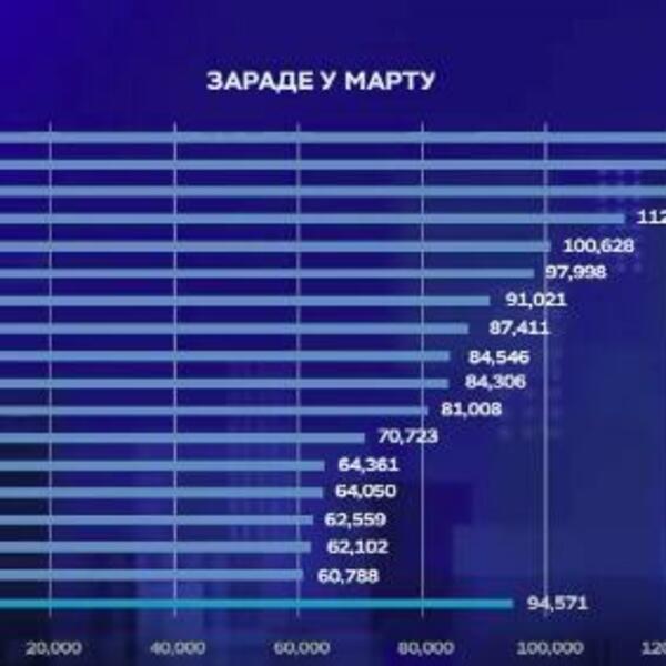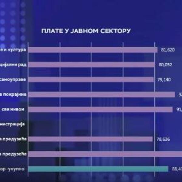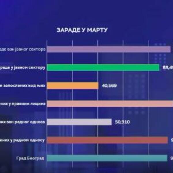 Prosečna zarada u javnom sektoru je 88.491 dinar, najviša u državnim preduzećima 108.750 dinara. U obrazovanju, kulturi i zdravstvu zarađuje se prosečno 80.000 dinara. Polovina zaposlenih u martu je zaradila do 65.000 dinara.