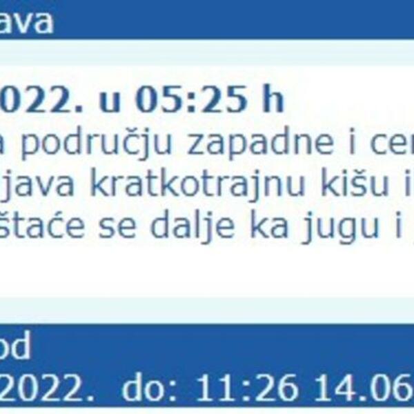 Republički hidrometeorološki zavod RHMZ najavio je oblačnost koja na području zapadne i centralne Srbije povremeno uslovlјava kratkotrajnu kišu ili plјusak ujutro i pre podne, a premeštaće se dalјe ka jugu i jugozapadu zemlјe.