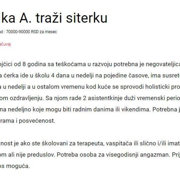 Bilo je i mizernih ponuda, pa smo tako pronašli oglas gde porodica u Novom Sadu nudi 29.400 dinara za posao čuvanja petomesečne bebe za koju je potrebno neprestano angažovanje, i to radnim danima.