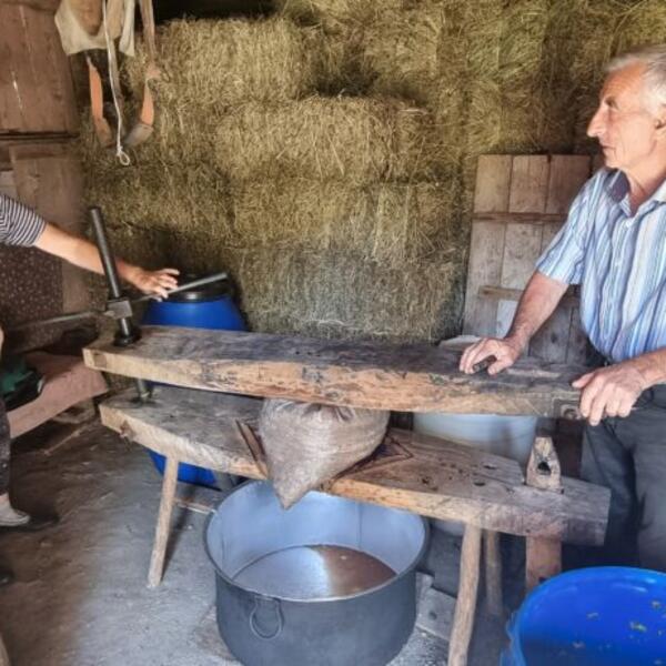 "Tučevina je izgnječeno voće koje pokupimo u burad i dobro je da ono tako prenoći a narednog jutra, što ranije počinje ceđenje. Za to koristimo tijesak, orlić i dve debele daske probušene da bi tijesak mogao da se privija po ručno iskopanim navojima. Između dve daske stavi se sitna torba napunjena tučevinom, odnosno izgnječeni voćem pa se privijajući orlić iscedi zadnja kap soka. Kad smo pri kraju ceđenja, Hajrija i ja naložimo vatru, stavimo kazan na metalno postolje koje zovemo sadžak. Kazan do vrha napunimo sokom i tada počinje varenje site. To traje pola dana i više i nije dobro da se prekida dok sita ne bude gotova", priča Murat.