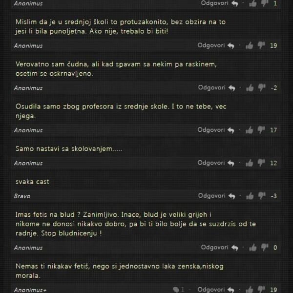 - Blago tebi, i mene opasno pale profesori, ta dominacija u moj potčinjeni položaj poslušne učenice. To mi je tako hot i oduvek sam osećala tu neku erotsku povezanost između učenica i profesora. Lože me uspešni muškarci u odelu ili košulji, prosedi, dobrodržeći. Novac mi nije bitan jer ga imam dovoljno ali taj fetiš ostaje deo mene dok sam živa. Poy. - glasi jedan od skandaloznih komentara.
