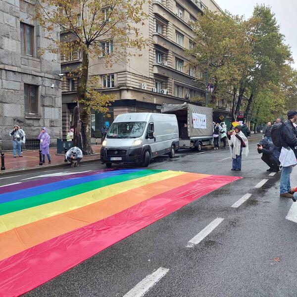 Policija je kolonu dočekala kordonom na polovini Beogradske ulice, zbog čega učesnici protesta menjaju rutu. Neki od njih pokušavaju da pronađu pukotine u kordonu policije i probiju se do Tašmajdana i dođu u sukob sa učesnicima Parade.