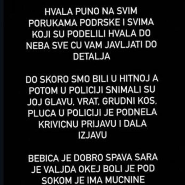 Da podsetimo, Saru je pretukao njen muž Damjan zbog njene želje da se razvede od njega i zbog navodnog mešanja njegove majke u njihov odnos. Dijana Marinković, majka pretučene Sare, gostovala je u jutarnjem programu Prve televizije i govorila je o stravičnom zločinu koji je pretrpela njena ćerka Sara koja je sada srećom dobro i polako se oporavlja.