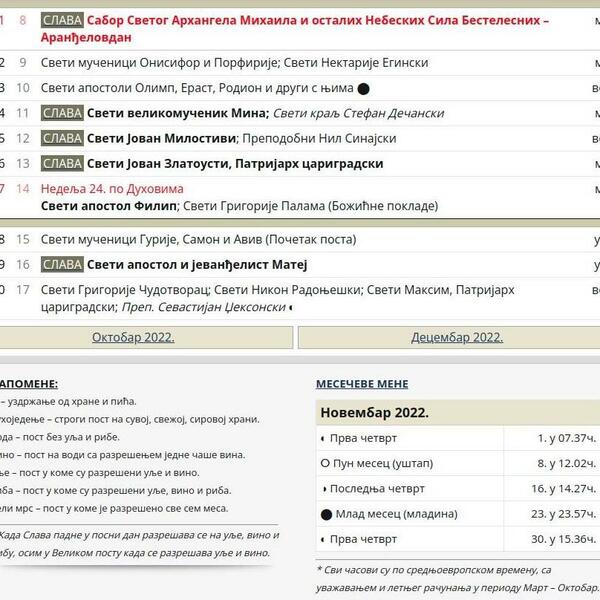 Pošto se bliži kraj oktobra, sve zanima crkveni kalendar za novembar 2022. godine.