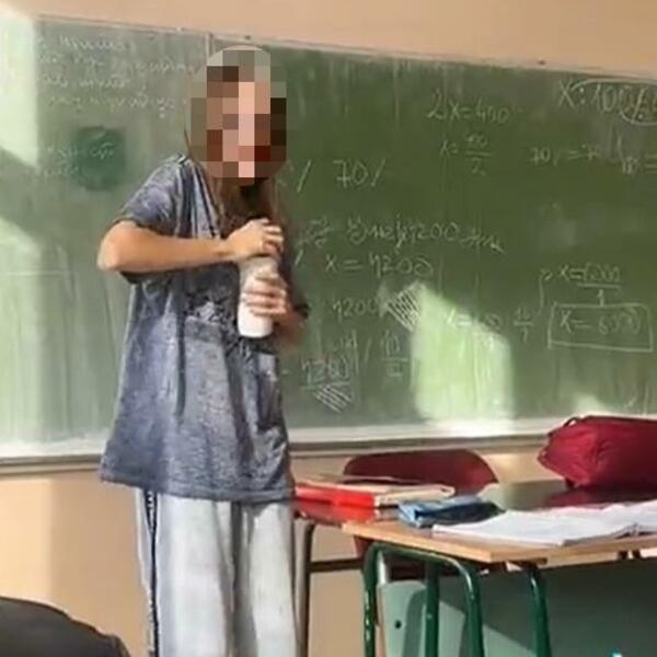 Dok je učenik stajao na vratima i dežurao da ne naiđe nastavnica, učenica je za to vreme uzela njen termos za kafu koji je stajao na katedri, pljunula u njega, obrisala ga, zatvorila i vratila na mesto na kojem je stajao.