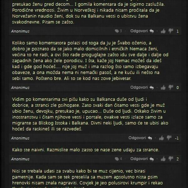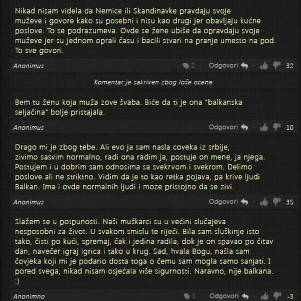 "Kad sam se razvela od balkanskog snoba koji me tretirao kao sluškinju i svoje vlasništvo..." Sad imam Švabu pored sebe koji u onome što se kod nas na Balkanu smatra običnim ručkom vidi specijalitete koje je on imao prilike jesti samo u restoranima... Drži me ko malo vode na dlanu", napisala je žena iz naših krajeva opisavši kakav joj je bio prvi brak, a kakav joj je sada ovaj drugi sa strancem.