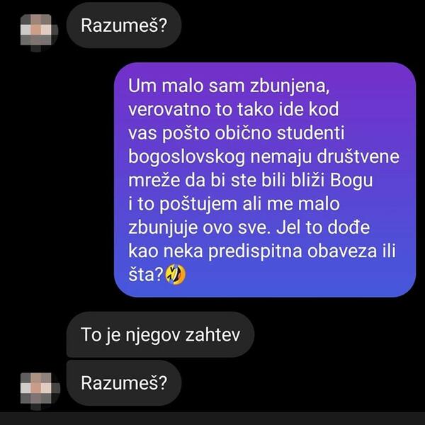 - Moja kuma se kratko zabavljala sa tim dečkom koji je tada studirao na Bogosloviji. Kada je raskinula počeo je da je progoni. Ode ona kod njegovog "nadređenog" popa da se požali, ali onda i taj pop počne da je muva - napisala je druga devojka.