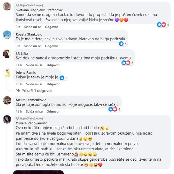 - Neka je živo i zdravo dete, a kakav će mu biti ljubavni, odnosno životni put, podržavala ja to ili ne, biće njegov izbor. Ne bih se tu puno mešala. Neka bude srećno u životu, ako je to njegov izbor.