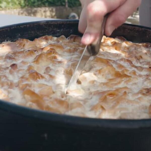 - Nakon što se kajmak ocedi, uzima se jedna kašika i stavićemo vodu koju sam ostavio da se kuva. U zagrejanu vodu dodajem mleko da zajedno proključaju, posle čega dodajem kašiku masti i kajmaka. Sve to se preliva preko pita - objašnjava Miki.