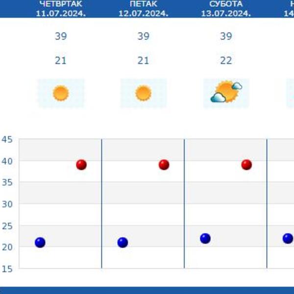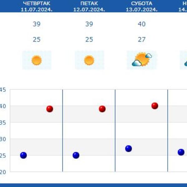Prema vremenskoj prognozi RHMZ za pet dana, u petak će u biti pretežno sunčano i veoma toplo. Duvaće slab i umeren, istočni i jugoistočni vetar. Najniža temperatura vazduha će biti od 18 do 25 stepeni, a najviša dnevna od 36 do 39 stepeni.