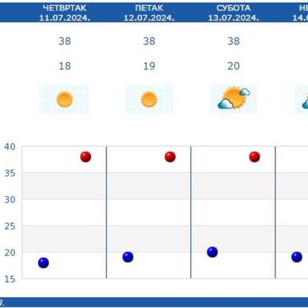 - Očekujemo nastavak visokih temperatura i sledeće nedelje, od 15. do 22. jula. U većini mesta će tada dnevni maksimum biti između 33 i 38 stepeni, a samo će lokalno dostizati 40 stepeni. Do subote ove sedmice neće biti padavina ni lokalnog razvoja oblačnosti, ali će u nedelju i početkom naredne nedelje biti uslova za retku ili izolovanu pojavu kratkotrajnog pljuska ili grmljavine – kaže Sovilj.