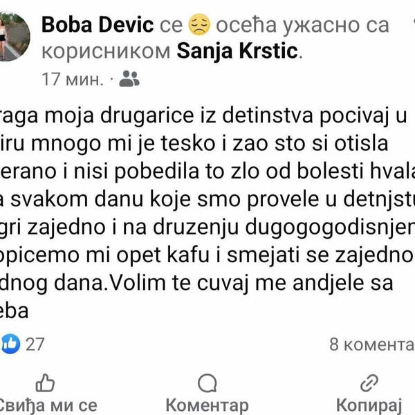 "Draga moja drugarice iz detinstva pocivaj u miru mnogo mi je tesko i zao sto si otisla prerano i nisi pobedila to zlo od bolesti hvala na svakom danu koje smo provele u detnjstu i igri zajedno i na druzenju dugogogodisnjem popicemo mi opet kafu i smejati se zajedno jednog dana. Volim te čuvaj me anđele sa neba", navela je Sanjina drugarica.
