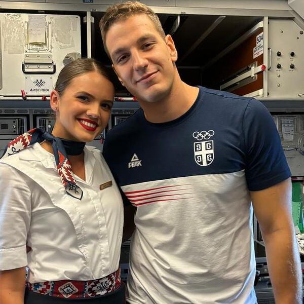 Na snimku, uz srpske olimpijce, dve šarmantne mlade dame u uniformama Air Serbia, jedna sa četiri crte na epoletama, a druga sa dve.
