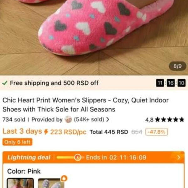 - Isti slučaj! Možda jednu papuču da kupim... Evo, nisam pametna - napisala je ona i prikazala sliku na kojoj se vidi da je istaknutim brojkama obeležena cena 223 dinara, dok je odmah pored, manjim fontom, napisana cena u totalu - 445 dinara što je, po svemu sudeći, puna cena za desnu i levu papuču.