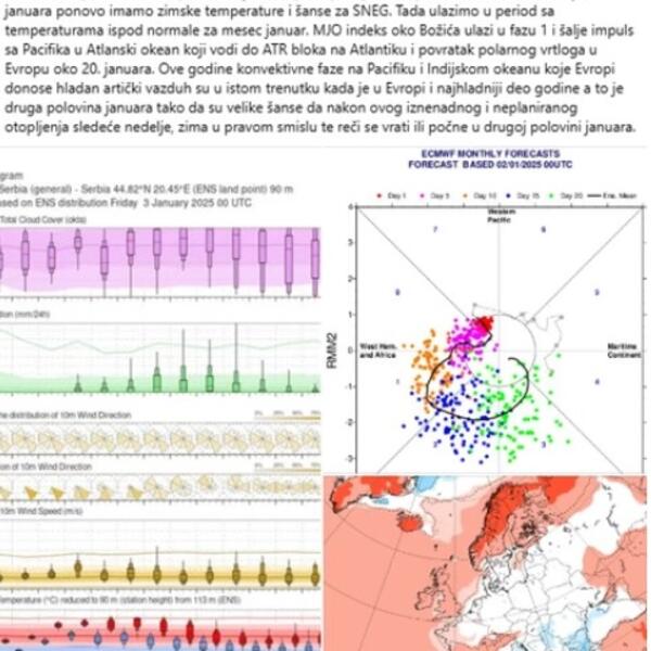 MJO indeks pravi zaokret narednih dana i posle jačeg otopljenja sledeće nedelje vraća zimu sa hladnim frontom, koji stiže između petka i subote, 10. i 11. januara. IRIE ECMWF i operativni ECMWF posle proleća početkom sledeće nedelje, sa frontom koji dolazi u petak 10. januara, sledećeg vikenda, 11. i 12. januara prognozira i puno snega - najavljuje meteorolog Ristić.