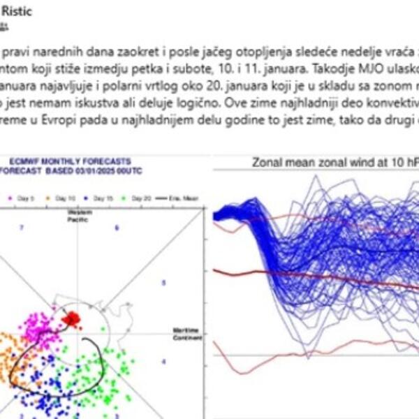 - Oko Božića impuls sa Pacifika i Atlantskog okeana najavljuje povratak polarnog vrtloga u Evropu oko 20. januara. U drugoj polovini januara velike su šanse da, nakon iznenadnog i neplaniranog otopljenja početkom sledeće nedelje, uletimo u prvi zimu - najavljuje Ristić.