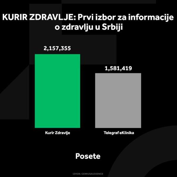 Podaci „Gemiusa“ iz februara pokazuju da je Kurir Zdravlje prvi izbor za sve one koji traže najnovije informacije o zdravlju, ishrani, vežbanju i mentalnom zdravlju u Srbiji. Ovaj portal je prepoznat kao ključna destinacija za sve koji žele kvalitetne savete i stručne članke o aktuelnim temama iz zdravstva. U poređenju s konkurencijom, Kurir Zdravlje beleži 31% više poseta od drugoplasirane Telegraf eKlinike, što potvrđuje njegovu superiornost i relevantnost. Sa sadržajem osmišljenim da zadovolji potrebe kako stručnjaka, tako i onih koji teže unapređenju svog zdravlja, Kurir Zdravlje je vaš pouzdani izvor informacija o svim aspektima očuvanja zdravlja.