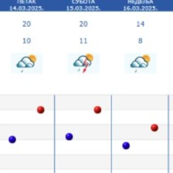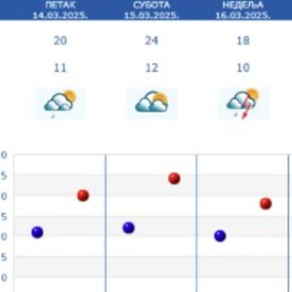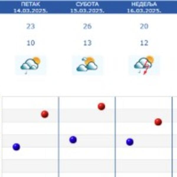 U petak, 14. marta, vreme će u Srbiji biti slično današnje, s tim što negde postoji mogućnost za povremenu slabu kišu, ali i pljuskove i grmljavinu. Temperature kao danas, minimalna 11, a maksimalna do 23 stepeni Celzijusovih.