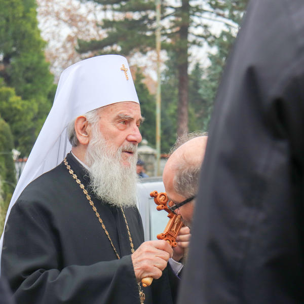 Patrijarha su u dvorištu manastira dočekali vernici, zajedno sa monasima i sveštenim licima.